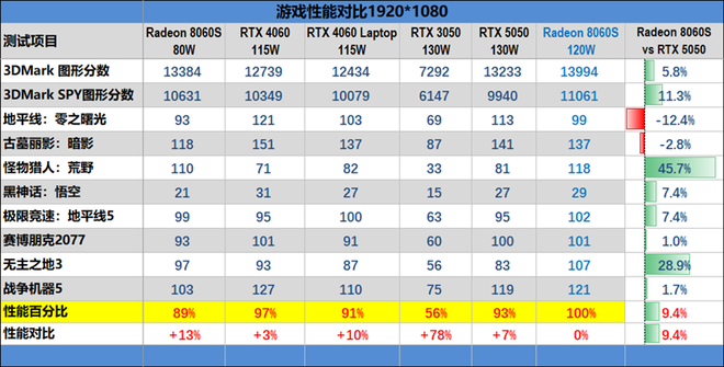 综合所有游戏的测试数据,Radeon 8060S的游戏性能要比RTX 5050高了9%,比RTX 4060 Laptop强了10%。