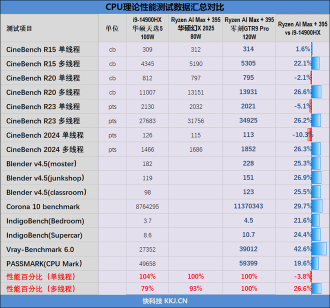 可以看出,不论是理论性能还是生产力效能,锐龙AI Max + 395都远强于i9-14900HX,平均领先幅度达到了26.6%。