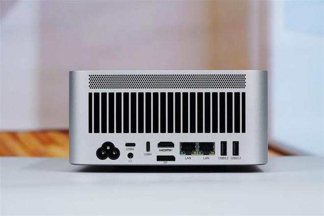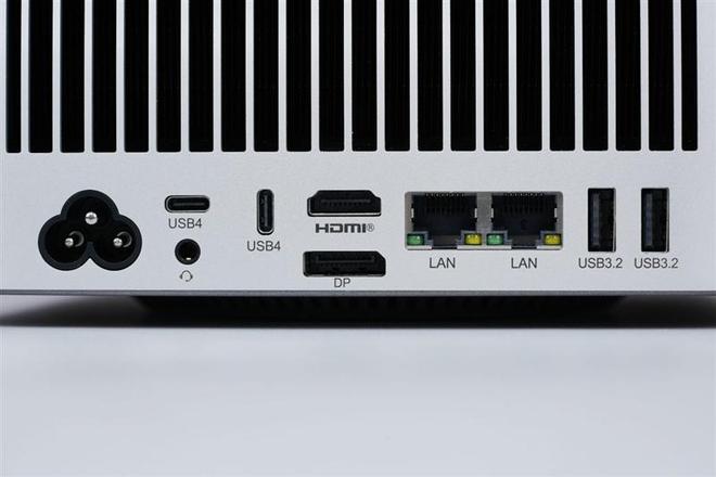 从左到右依次是电源插孔、2个USB4 40Gbps接口、3.5mm耳麦合一接口、HDMI 2.1 8K 60Hz、DP 2.1 8K 60Hz、2个万兆网口、2个USB 3.2 10Gps接口。