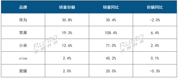 在市场竞争格局中,华为的领先优势十分显著。30.8%的销量份额不仅让其稳居榜首,更在销量同比上实现30.4%的增长。