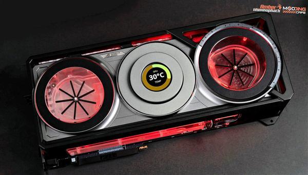 在显卡正面,Astral原本的三风被换成了两个亚克力水箱窗口和一个显示温度数据的中央显示屏,遗憾的是目前尚未看到该模组的背部照片。