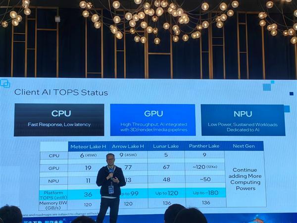 Intel目前的酷睿Ultra 200H/HX/V系列、即将发布的酷睿Ultra 300系列,拥有强大的CPU+GPU+NPU三位一体AI引擎,算力不断迅猛增长,Lunar Lake已经做到平台算力最高120 TOPS,Panther Lake更是将进一步加强到180 TOPS。