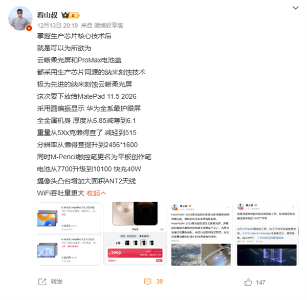 此前,数码博主"看山叔"曝光过一款支持圆偏振显示的华为平板,由此推测,曝光产品正是全新MatePad 11.5。