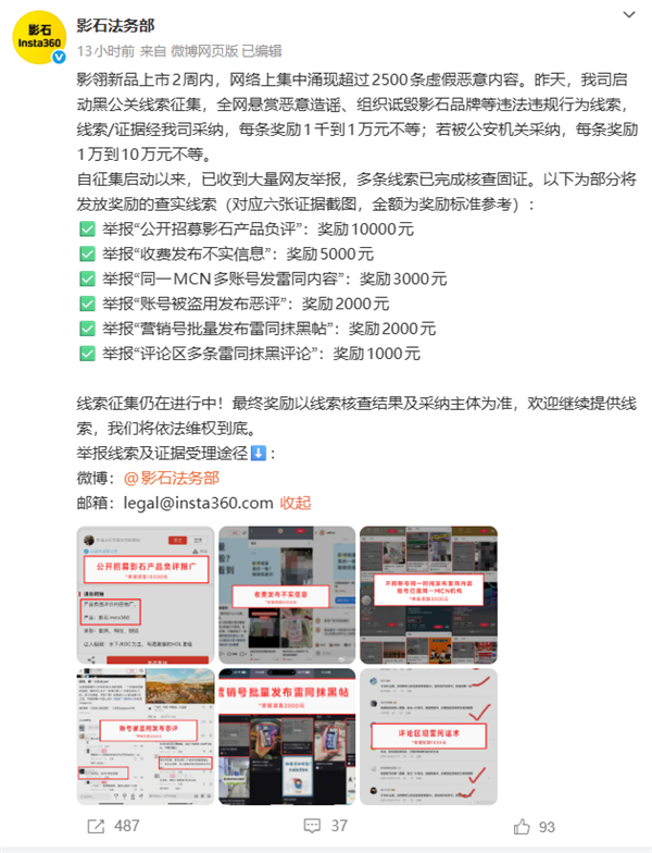 为打击此类行为,影石创新启动黑水军线索公开征集机制,全网悬赏恶意造谣、组织诋毁影石品牌等违法违规行为线索。
