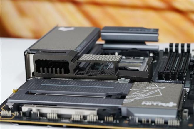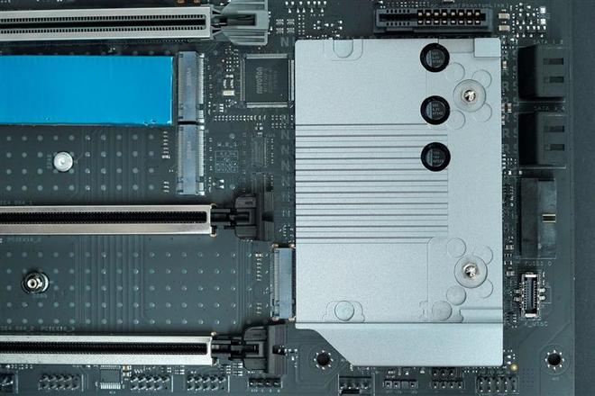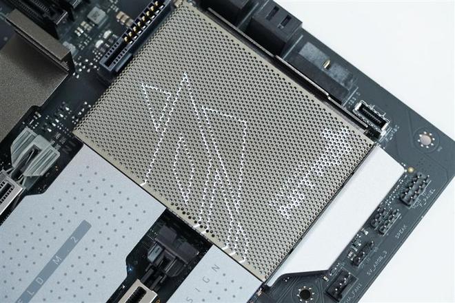 主板下半部分芯片组散热片和M.2 SSD散热片特写。