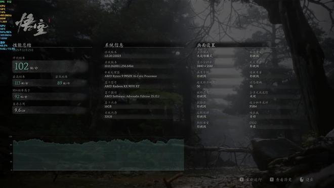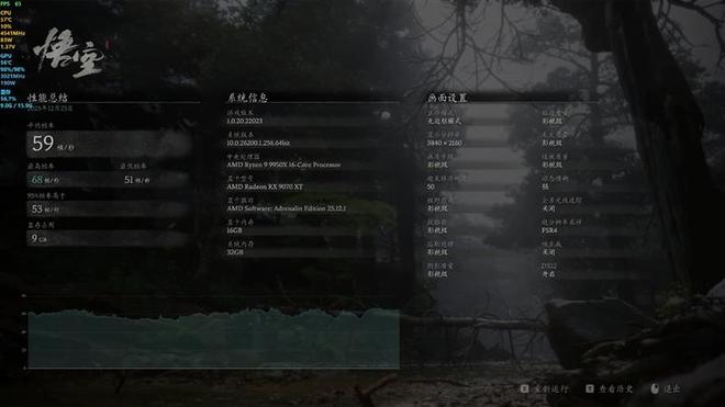 在《黑神话·悟空》中,使用影视级画质预设,关闭光追,FSR4采样精度设置为50,记录4K分辨率时的游戏帧数。