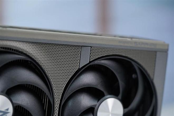 蓝宝石NITRO+氮动RX 9070 XT显卡的环形飞翼轴流风扇特写,中间位置的风扇采用了反转设计,强化对流效果加速气流运动,显卡正面的钛金色面板上密布着大量的冲孔,既可以减重同时也增加了散热面积,也让蓝宝石NITRO+氮动RX 9070 XT显卡充满了工业的力量感。