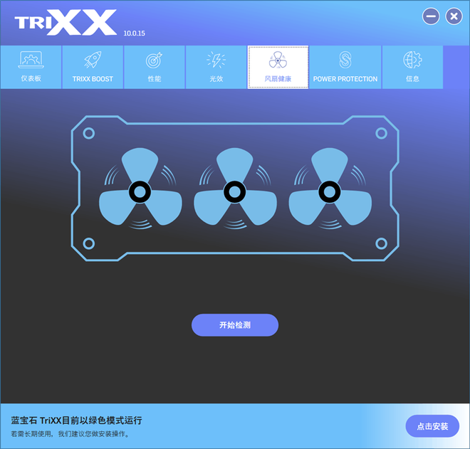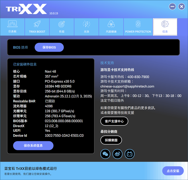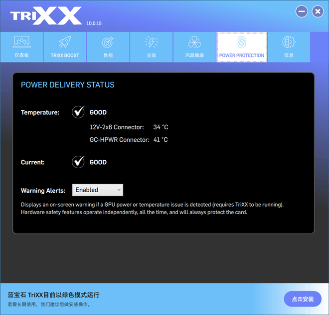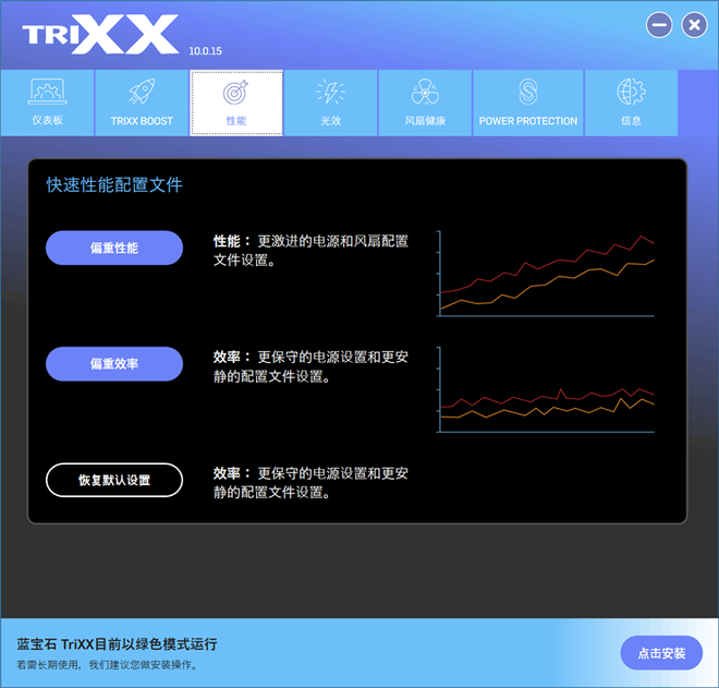 蓝宝石的TriXX软件是对蓝宝石显卡进行管理的工具软件,它支持免安装绿色使用,非常方便,当然如果是需要长期使用,还是推荐进行安装,这样运行也会更加稳定。