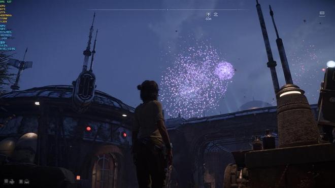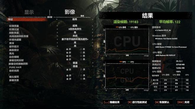 在《古墓丽影:暗影》中,使用4K分辨率和最高画质进行测试,关闭超采样,平均帧率为122。