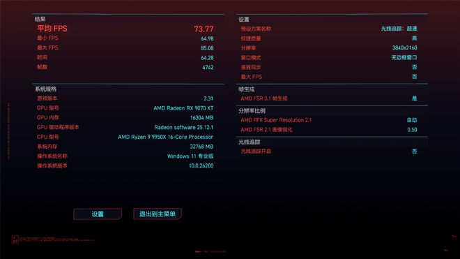 在《赛博朋克:2077》中,我们使用4K分辨率和光线追踪:超速预设,开启AMD FSR 3.1帧生成功能,测试帧率为73.77。