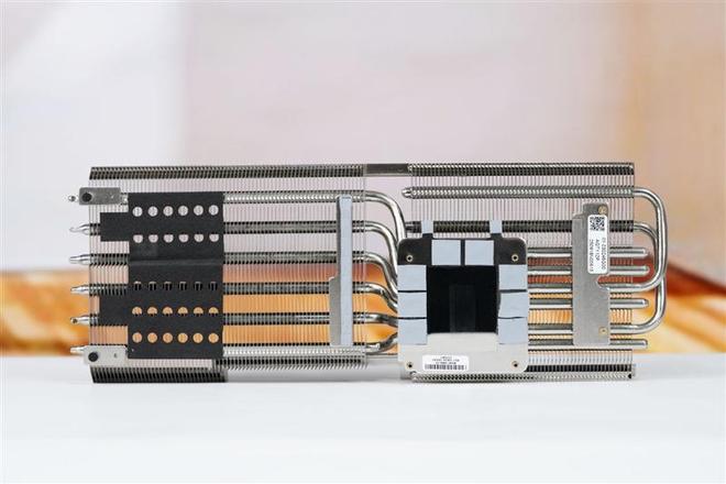 蓝宝石NITRO+氮动RX 9070 XT显卡的散热器,6根优化复合热管通过真空腔均热板将核心部分的热量传递到密集的散热鳍片上,配合风扇高效散热。