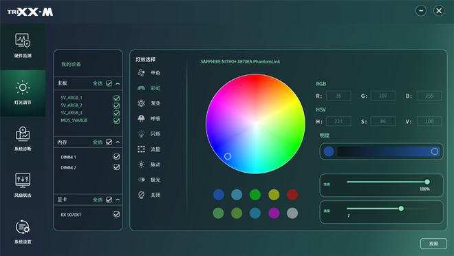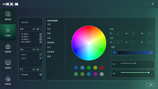 TriXX-M软件的灯光页面,可以看到除了主办本身的灯光效果,TriXX-M软件还可以对内存以及显卡的灯效进行统一控制。