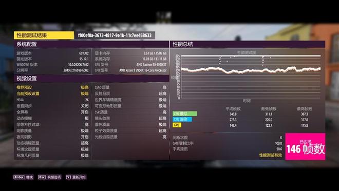 在极限竞速:地平线5中,使用4K分辨率极端画质测试,最终测试成绩为146fps。