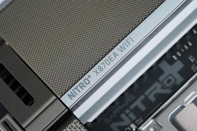 蓝宝石氮动Nitro+ X870EA PhantomLink主板的供电散热片上,印有显卡型号和氮动Logo标识。