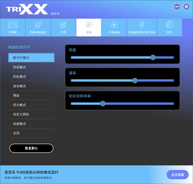 虽然蓝宝石NITRO+氮动RX 9070 XT显卡只在顶部提供了一条灵动岛RGB光效系统,但在TriXX软件中依旧提供了大量的灯效模式选择,而且很多模式中还可以对灯光的亮度,速率和切换频率进行自定义,可玩性极高。