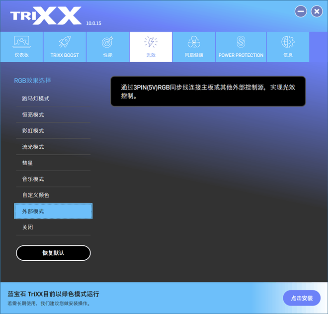 另外显卡灯效控制提供的模式也少于显卡用TriXX软件中的模式,而且我们发现有时候TriXX-M软件的灯效控制复发覆盖显卡用TriXX软件的设置,所以最佳选择还是使用5V RGB灯效同步线将显卡连接至主板,同时在显卡的TriXX软件中将显卡灯效设置为外部模式,就可以完美的交由主板TriXX-M软件控制并自动同步灯效。
