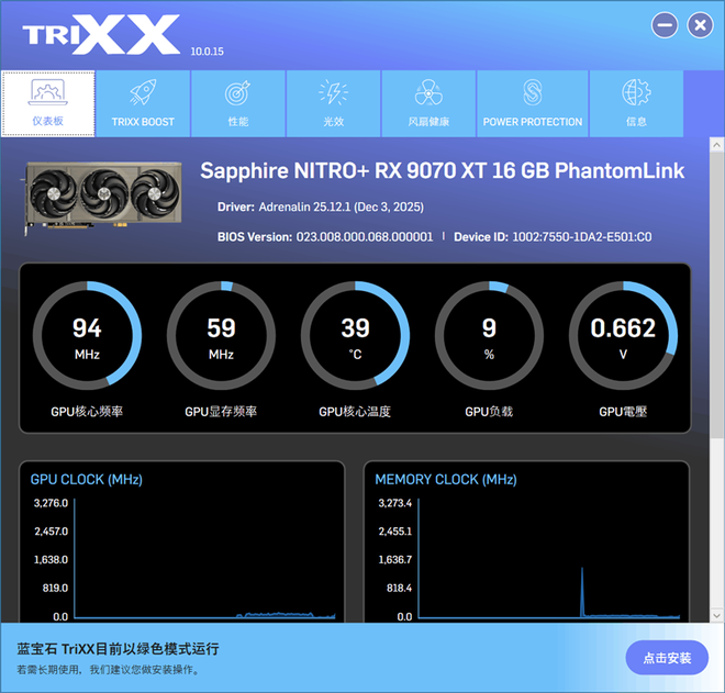 在TriXX软件首页可以很直观的看到当前蓝宝石显卡的工作情况,包括GPU核心频率,显存频率,核心温度,GPU负载以及GPU电压,核心频率和显存频率还有动态图标记录历史工作情况。
