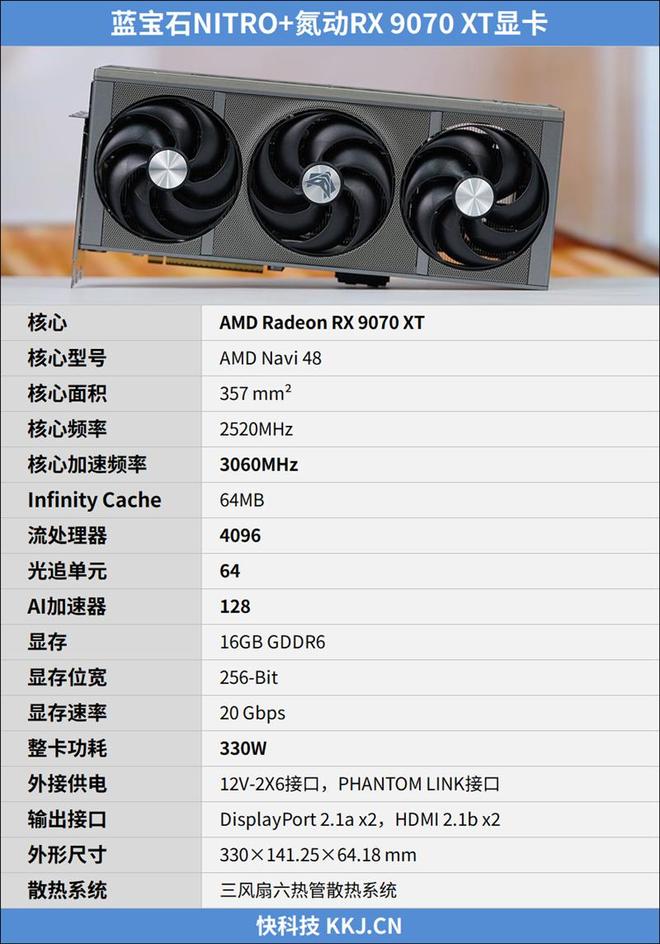 蓝宝石NITRO+氮动RX 9070 XT显卡基于AMD Radeon RX 9070 TX核心,4nm工艺制造,拥有4096个流处理器,64个光追单元,128个AI加速器,核心频率2520MHz,加速频率超过3GHz达到了3060MHz,拥有64MB的Infinity Cache,显存方面则是16GB的GDDR5显存,256-Bit显存位宽,显存速率高达20Gbps。