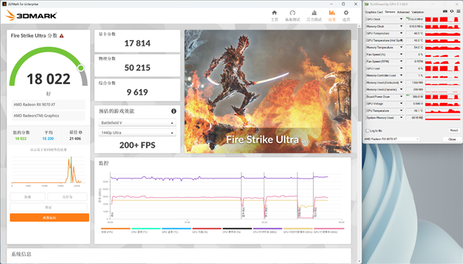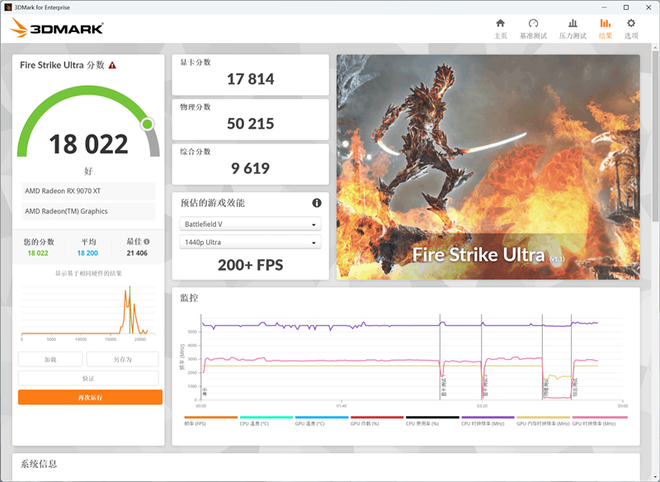 在3DMark的Fire Strike Ultra(DX11+4K渲染分辨率)测试中,总成绩为18022,其中显卡分数为17814。