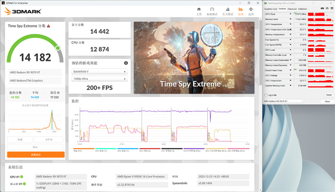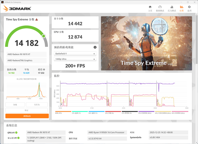 在3DMark的Time Spy Extreme(DX12+4K渲染分辨率)测试中,总成绩为14182,其中显卡分数为14442。