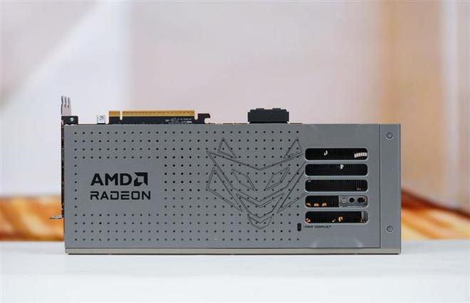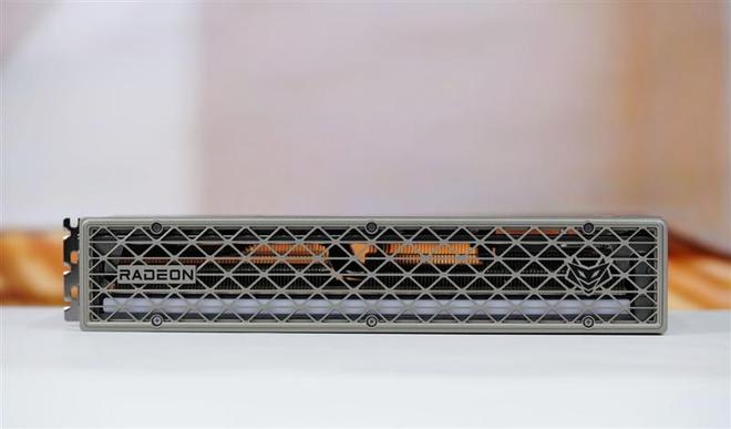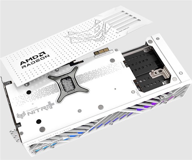 蓝宝石NITRO+氮动RX 9070 XT显卡安装磁吸式快拆装饰背板之后的效果,金属灰色的背板上同样有精密的微型冲孔,同时也印有蓝宝石氮动系列显卡的Logo和AMD RADEON字样。