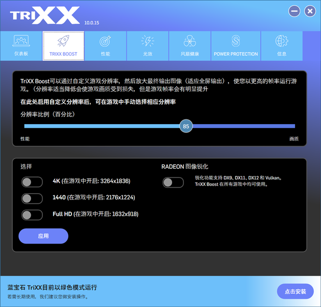 在TriXX软件还提供了TRIXX BOOST功能提高显卡的性能,原理类似游戏的超分辨率采样,略微降低显卡实际的渲染分辨率,并放大的输出,以提高帧率,在一些不自带超分辨率采样的游戏中也能提升性能表现。