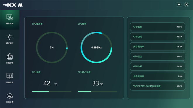 TriXX-M软件不支持绿色免安装使用,需要先安装后使用,软件首页可以实时监控当前电脑主要元件的工作情况,CPU的使用率和频率有环形仪表盘显示,侧面表格中也提供了从CPU温度到内存占用率到显卡温度甚至SSD温度等一系列数据。
