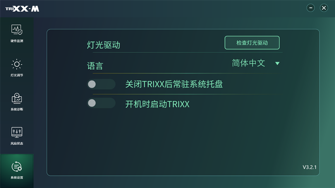 在系统设置中,TriXX-M软件还可以检查更新灯光驱动。