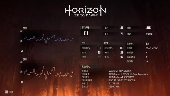 在《地平线:零之曙光》中,使用4K分辨率和终极质量画质进行测试,关闭超采样功能,平均帧率为111。
