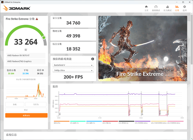 在3DMark的Fire Strike Extreme(DX11+2K渲染分辨率)测试中,总成绩为33264,其中显卡分数为34760。