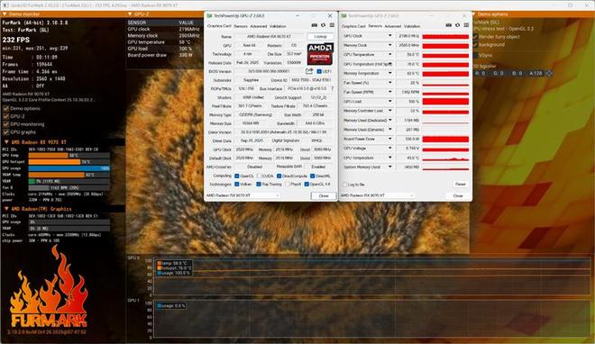 我们使用Furmark对蓝宝石NITRO+氮动RX 9070 XT显卡进行10分钟的烤机,室温约25度,GPU功耗稳定在330W,核心频率2196MHz,温度76.0度,风扇转速1162RPM。