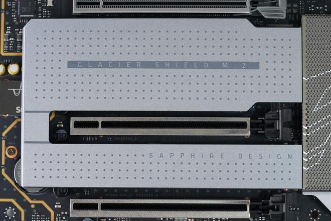 蓝宝石氮动Nitro+ X870EA PhantomLink主板下半部分特写,M.2 SSD的银色散热片上印有圆点装饰图案,和氮动系列的钛金色网孔面板相呼应。