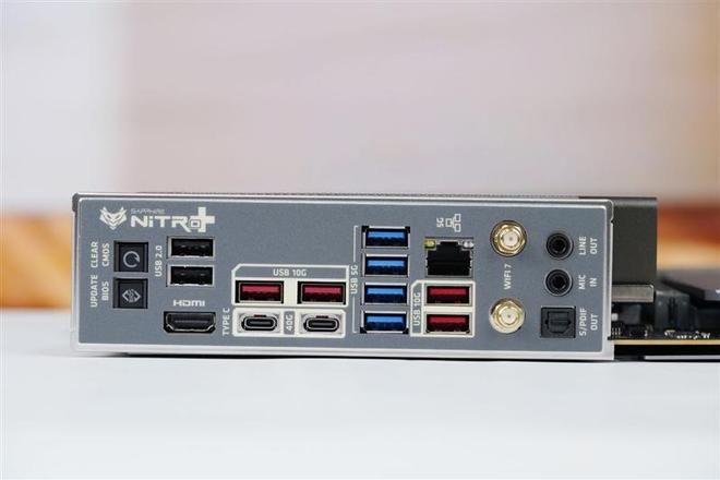蓝宝石氮动Nitro+ X870EA PhantomLink主板的IO挡板,提供了两个黑色的USB,2.0接口用于连接键鼠,四个蓝色的5Gbps USB-A接口和四个红色的10Gbps USB-A接口,两个40Gbps的USB-C接口,一个HDMI接口,一个5G有线网口,一组Wi-Fi 7天线接口,一组支持数字音频光纤输出接口的音频接口。