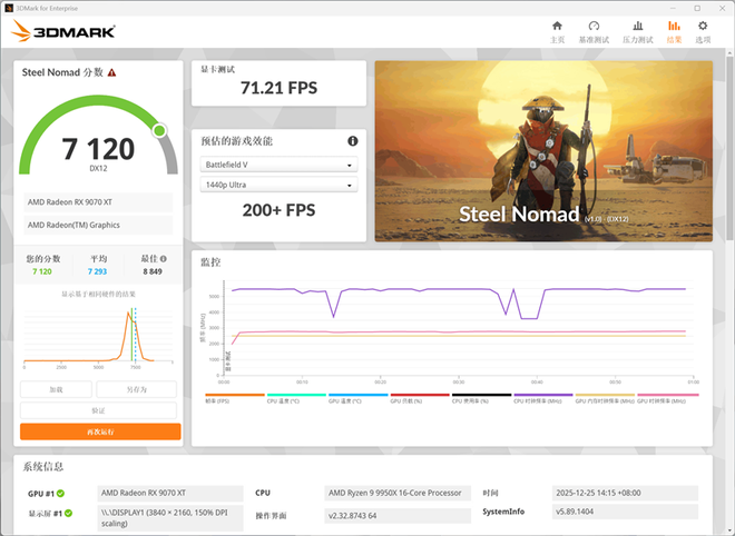 在3Dmark中测试可靠性、稳定性和持续性能的Steel Nomad测试中,总成绩为7120,其中显卡测试成绩为71.21FPS。