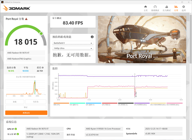 在3Dmark中测试实时光追性能的Prot Royal测试中,总成绩为18015,其中显卡测试成绩为83.4FPS。