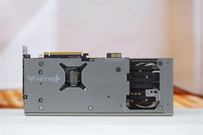 蓝宝石NITRO+氮动RX 9070 XT显卡的底部特写。