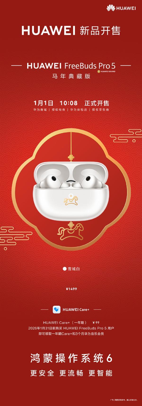 1月1日消息,今天10:08,华为FreeBuds Pro 5马年典藏版正式开售,售价1499元。