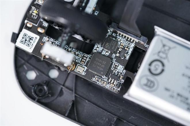 电路板的左下角,便是这款鼠标的灵魂NORDIC 54芯片了,这是当下最强大的鼠标芯片之一,配合雷柏自研的Power+炎龙固件技术,能够支持2WFPS的全段扫描帧速率和最快0.225ms的无线按键速度(仅MAX版本支持8K按键扫描率)。