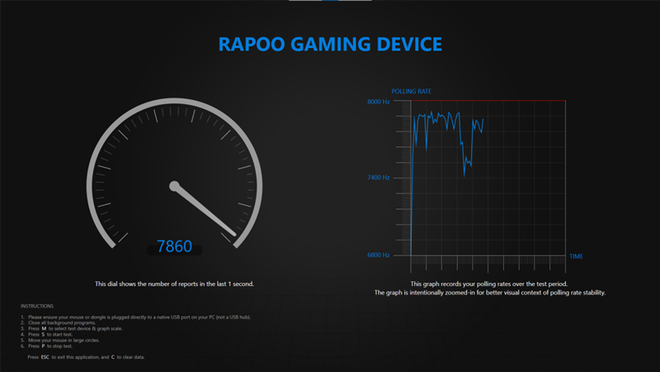我们用雷蛇制作的PollingRateTesterApp软件对雷柏VT0 Max与VT0进行了测试,在2.4G模式下,二者的8K回报率下实测回报率均轻松超过7500,已经十分接近8K的理论速率。