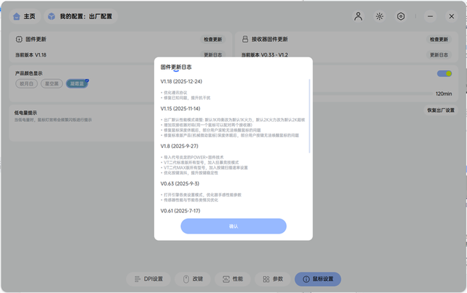 在右下角的鼠标设置界面,就可以看到当前的固件版本以及更新按钮。我们点开更新日志,可以看到这款鼠标在9月27日的V1.8版本中,就导入了代号"炎龙"的POWER+固件技术,还为VT0标准版引入了狂暴竞技模式。