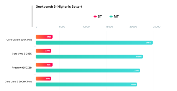前两天我们看到桌面版的酷睿Ultra 9 290K Plus,和移动版的酷睿Ultra 9 290HX Plus先后现身Geekbench,遗憾的是290HX Plus的跑分并不完整。