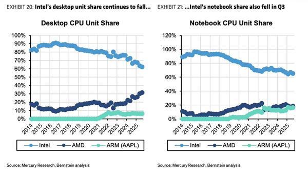 相比之下,曾经的龙头Intel虽仍占据大头,但已从2016年接近100%的巅峰状态下滑至60%左右。