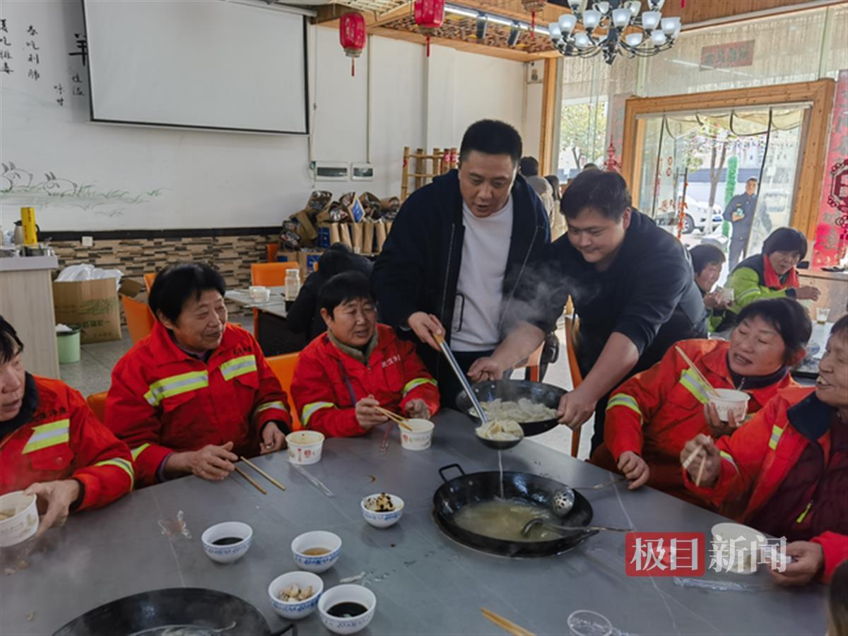 “你们辛苦了,多吃点,不够还有。”这时,申荣进端着一盆水饺过来,劝着环卫工吃饱喝好。眼尖的环卫工人董志英发现,申荣进就是隔壁常青家宴的老板,他连续4年在入伏之日起,悄悄在店门口摆设爱心冰箱的爱心人士。环卫工人等户外工作者,都可以免费领取矿泉水和防暑降温的药品。经打听,申荣进也是胡记羊肉馆的老板。