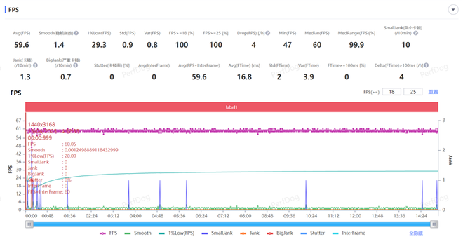 接着我们增加难度,使用《崩坏:星穹铁道》手游进行测试,位于星槎海中枢跑图15分钟,游戏帧率全程稳定在60FPS水平线,游戏的平均帧率为59.6FPS。