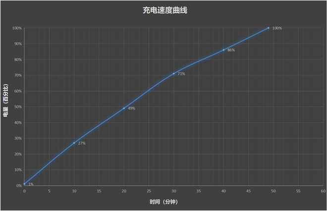 在充电测试前,我们开启超快充电模式,经过测试,从1%开始记录电量,10分钟充电27%,20分钟充电49%,接近一半,30分钟电量充至71%,最终完全充满用时49分钟。