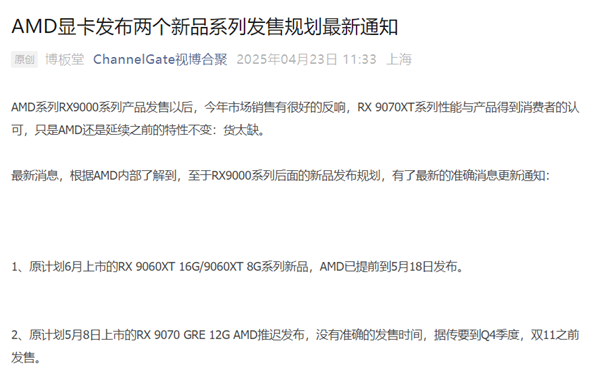 1、原计划6月上市的RX 9060 XT 16GB/9060 XT 8GB系列新品,AMD已提前到5月18日发布。