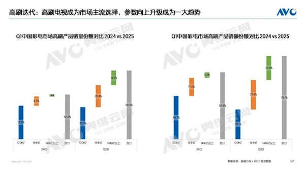 4月25日消息,奥维云网(AVC)最新数据显示,2025年一季度中国彩电市场呈现出"量降额升"的显著特征。