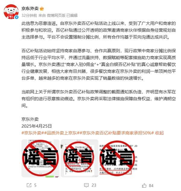 京东外卖回应补贴要求商家承担50%:恶意造谣!不会设置强制分摊比例