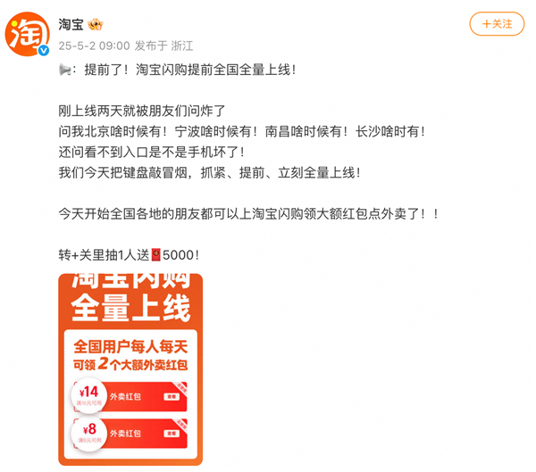 5月2日消息,今天上午,淘宝官方微博宣布:淘宝闪购提前全量上线,此前原定于5月6日上线。