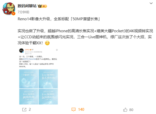 OPPO Reno14系列成Live图神机!超越iPhone、媲美大疆Pocket 3